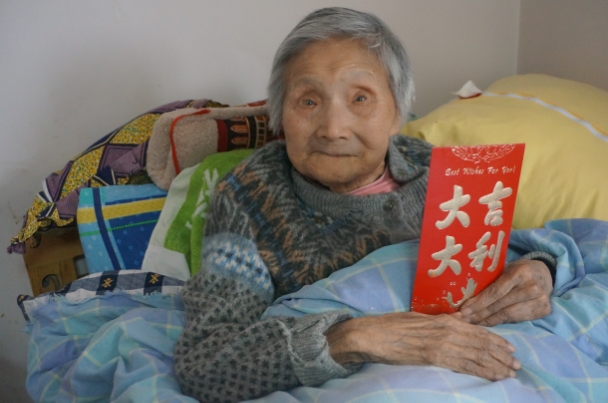 百歲老人接過紅包笑開顏
