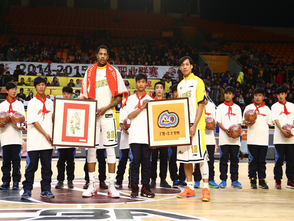 晚上,巍巍希望小學(xué)的師生還現(xiàn)場(chǎng)觀戰(zhàn)了廣廈對(duì)重慶的比賽。入場(chǎng)儀式,廣廈球員們各牽一名學(xué)生進(jìn)場(chǎng)并高唱國歌。中場(chǎng)休息的時(shí)候,廣廈球員還為每一名學(xué)生贈(zèng)送了一個(gè)籃球,而希望小學(xué)的學(xué)生則回贈(zèng)兩幅他們親手制作的畫給球員。
